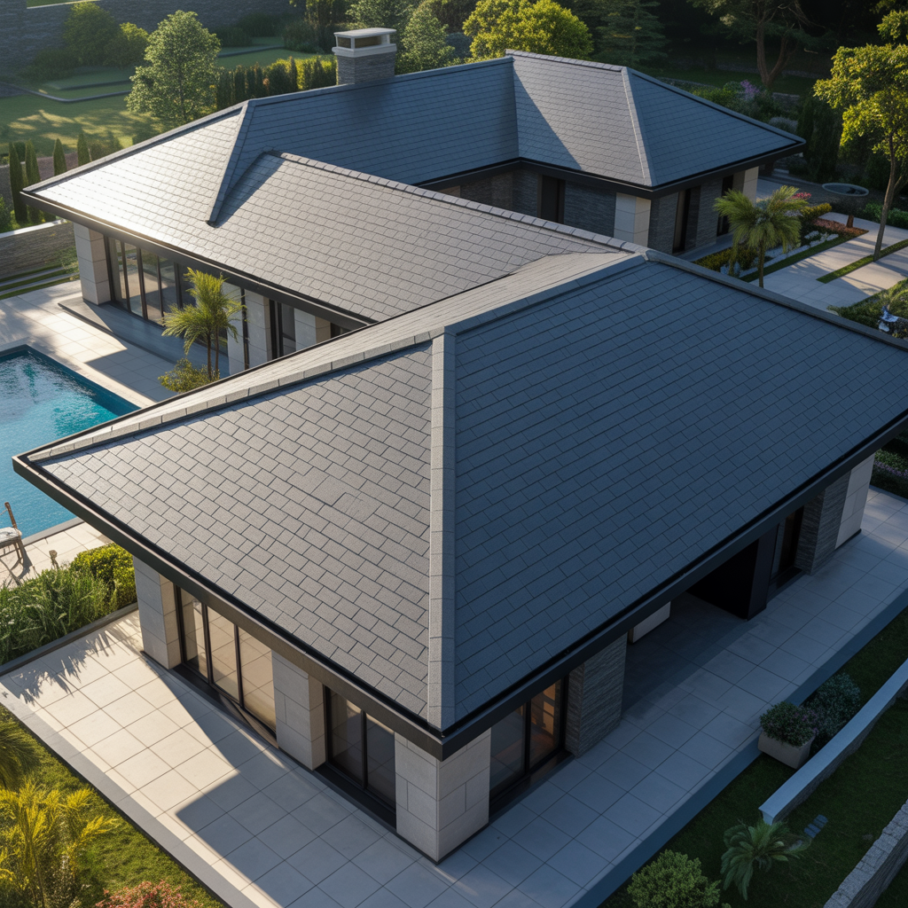 A blend of stone-coated steel roofing for unmatched strength and wood ceiling designs for warmth and aesthetics, ensuring long-lasting performance and elegance.